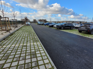 L’espace est clôturé, éclairé et dédié aux véhicules légers. A la place de l’enrobé, les places de stationnement sont aménagées avec des alvéoles en béton pour faciliter l’infiltration de l’eau de pluie.
