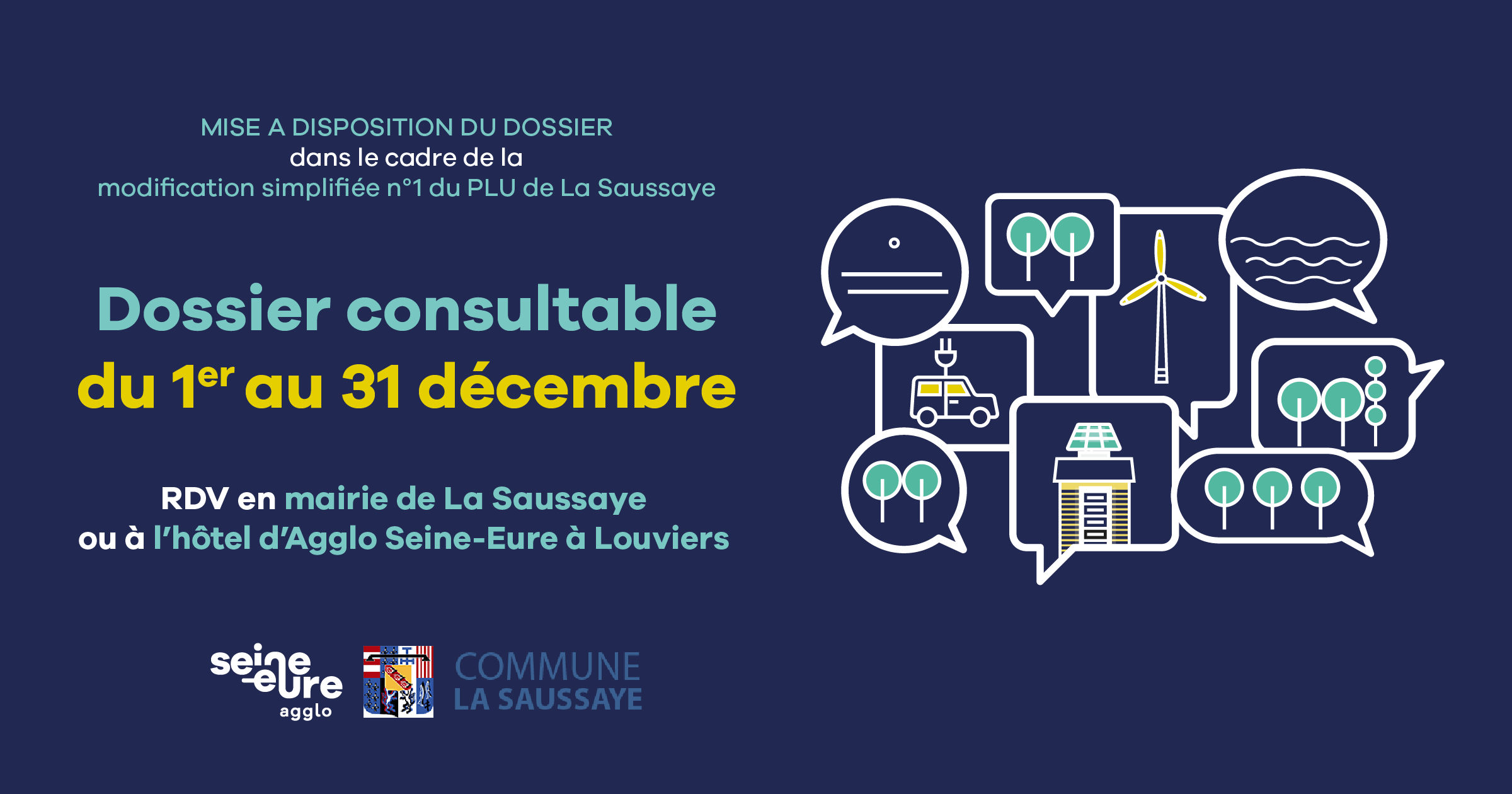 Un dossier d’information et de présentation de la modification simplifiée est mis à disposition du public au siège de l’Agglo Seine-Eure (1 place Thorel, à Louviers), ainsi qu’à la mairie de La Saussaye (6 place du cloître, à La Saussaye), aux heures d’ouverture au public.