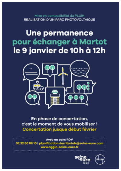 Un besoin d’informationS, des remarques ou avis sur la modification ? Une permanence publique se déroule à la mairie de Martot vendredi 9 janvier, de 10h à 12h. L’accès à cette permanence est possible avec ou sans RDV (qui peut être pris par téléphone au 02 32 50 86 10 ou par mail planification-territoriale@seine-eure.com) et permet à toute personne de venir s’informer sur la procédure et échanger avec un technicien en charge du dossier.