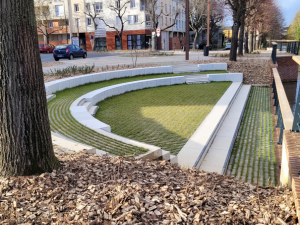 - Une résine rouge (bientôt posée) sur certaines zones de circulation avec des motifs rappelant les gouttes d’eau incitera les automobilistes à ralentir