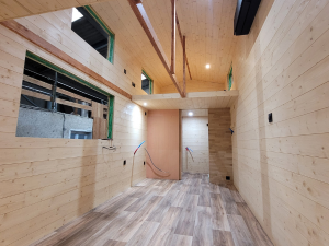 La grande baie vitrée donnera sur la campagne quand la tiny house aura rejoint la parcelle de sa propriétaire. « La tiny house est construite sur un châssis. Si la personne veut se déplacer avec, c’est possible ! » souligne Simon Quézédé. Il suffit de débrancher la pompe à chaleur et les fluides (eau, électricité, internet) et le tour est joué.