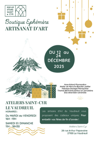 Du 14 au 24 décembre, découvrez le pop’up store “Pop’up Saint Cyr” aux Ateliers Saint Cyr, au Vaudreuil. Cette boutique éphémère met à l’honneur l’artisanat d’art à travers des créations uniques : bijoux, maroquinerie, art de la table, céramique, peinture sur porcelaine, objets d’art…
