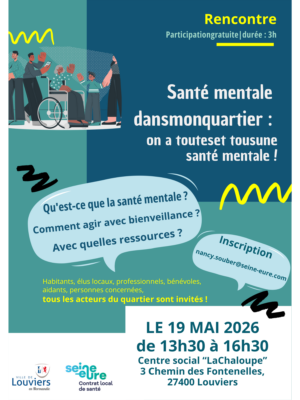 Parce que la santé mentale nous concerne toutes et tous, l’Agglomération Seine-Eure et la Ville de Louviers invitent les habitants et acteurs du territoire à participer à un temps d’échange ouvert et convivial autour de cette thématique essentielle.